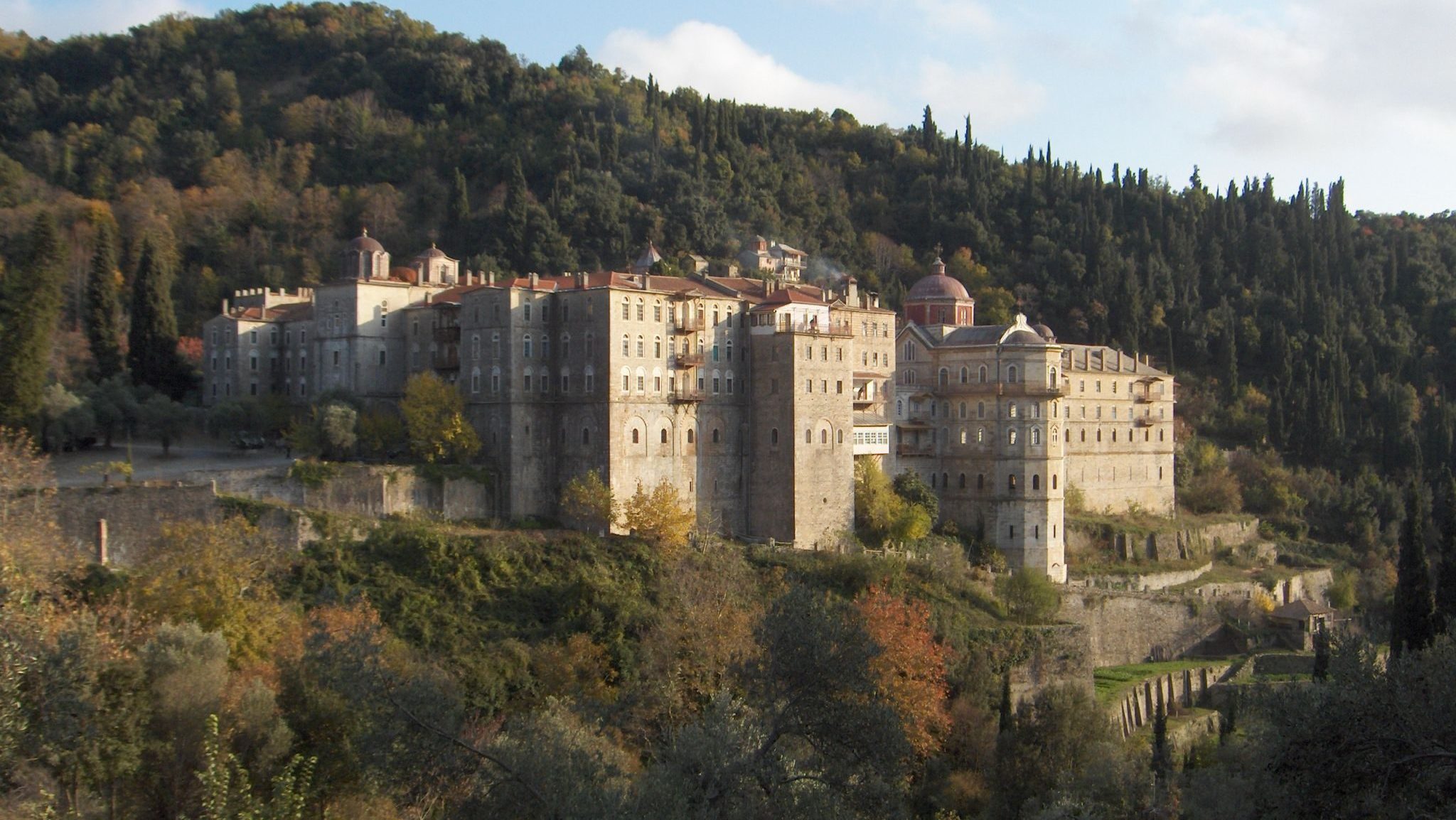 Geographically it’s in the Athos area, on the peninsula’s northwest side, on a slope that keeps moisture and greenery almost year-round. It’s not one of the monasteries that you spot from the sea. It requires approach, a bit of ascent, and then rewards you with that fortress-in-the-woods feeling.